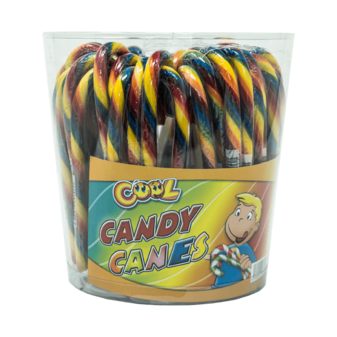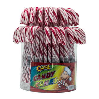 50 Zuckerstangen á 14 g, einzeln verpackt, rot-weiß gestreift, in durchsichtiger Plastikdose