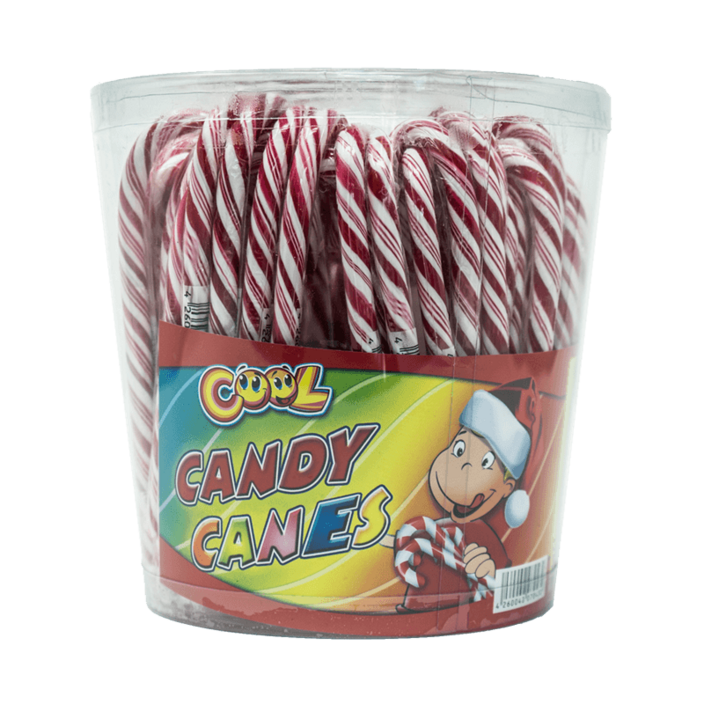 50 Zuckerstangen á 14 g, einzeln verpackt, rot-weiß gestreift, in durchsichtiger Plastikdose