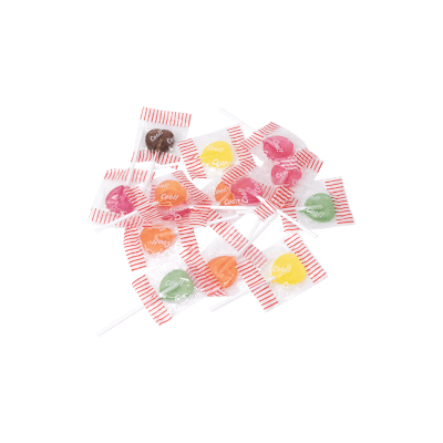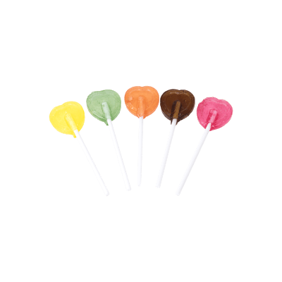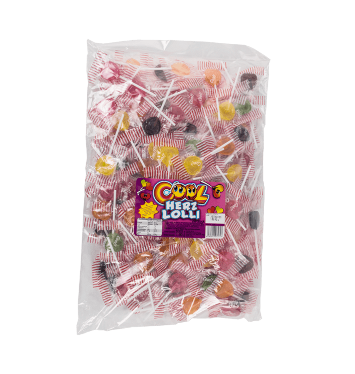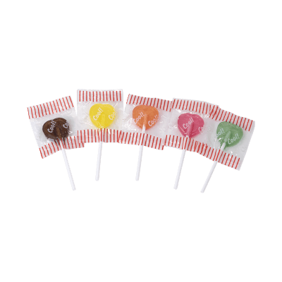 Lutscher in Herzform in 6 verschiedenen Geschmacksrichtungen, einzeln verpackt, im Beutel