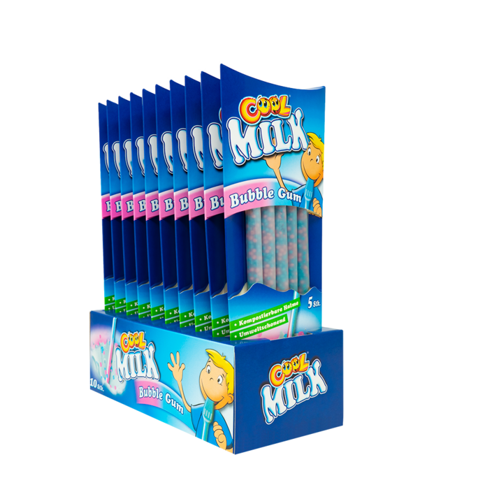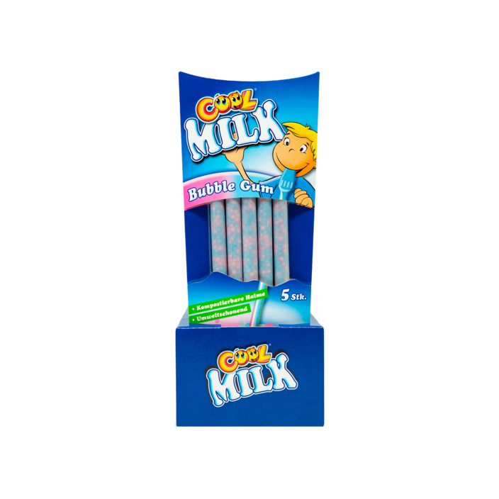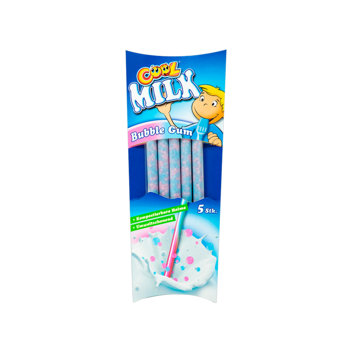 kompostierbarer Strohhalm - gefüllt mit Zuckergranulatmit Bubble Gum Geschmack - 5er Pack, in Pappkarton