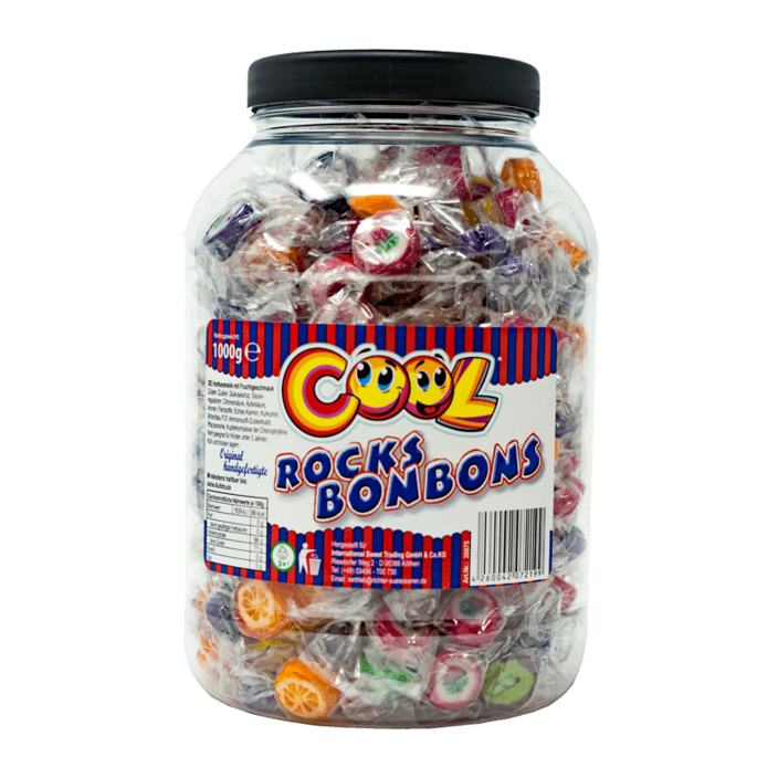 Rocks Bonbons einzeln verpackt, in durchsichtiger Plastikdose
