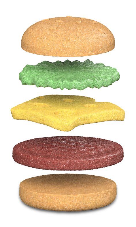 Zucker, Stärkesirup, Wasser, Traubenzucker, Geliermittel: Gelatine, Maisstärke, Aromen, Farbstoffe: E129, E102, E133, E153, E160a, E163.